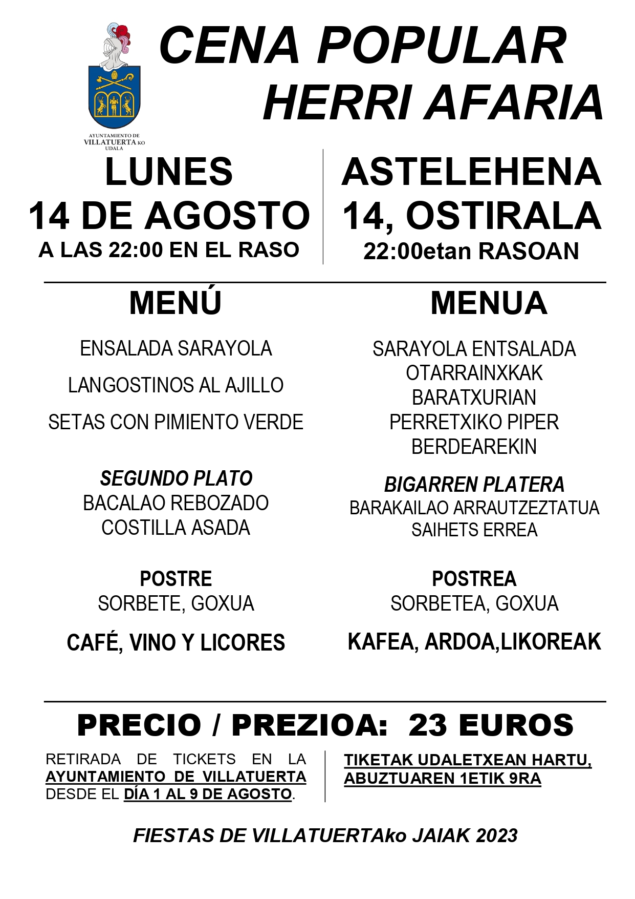 El Ayuntamiento de Villatuerta con motivo de las fiestas patronales de Agosto ha programado la cena popular para el lunes día 14 de agosto con el siguiente menú. La retirada de tickets se realizará en las oficinas municipales del 1 al 9 de agosto.