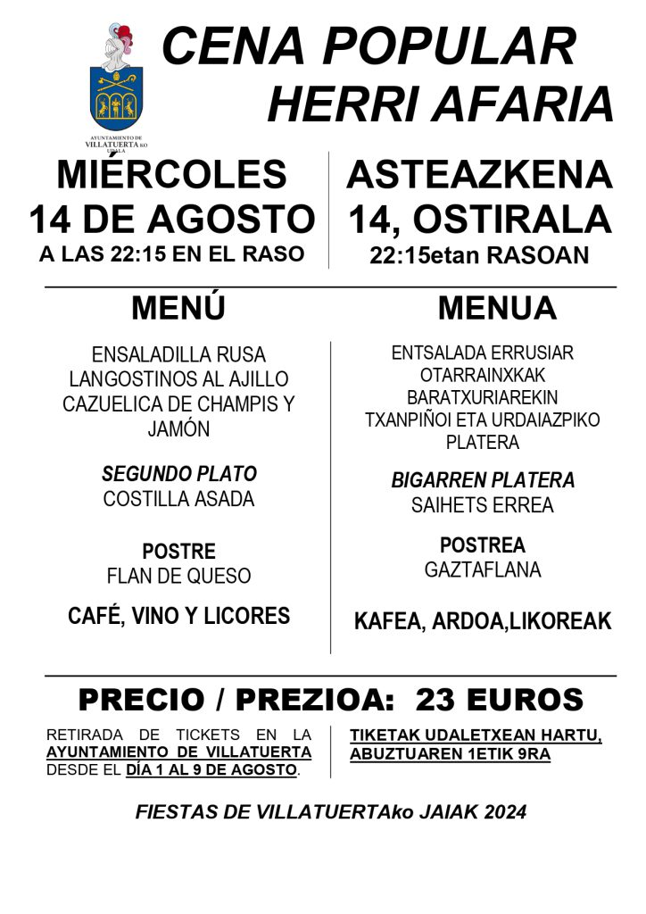 El miércoles 14 de agosto tendrán comienzo las fiestas de agosto y está programada una cena popular que tendrá lugar en la plaza «El Raso». La retirada de tikets es en el AYUNTAMIENTO DE VILLATUERTA desde el DÍA 1 al 9 DE AGOSTO.
