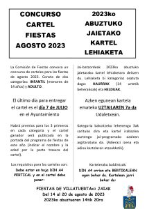 El Ayuntamiento de Villatuerta convoca al concurso de carteles para las fiestas de agosto de 2023. El concurso consta de 2 categorías, Infantil para menores de 14 años y categoría Adulto.