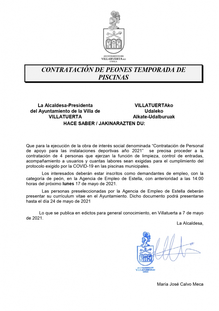 El Ayuntamiento de Villatuerta va proceder a la contratación de cuatro personas para apoyo de las instalaciones deportivas en la campaña de piscinas.