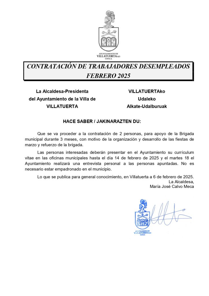 El Ayuntamiento de Villatuerta va proceder a la contratación de 2 personas de apoyo a la brigada municipal de Villatuerta durante 3 meses con motivo de la organización de las fiestas de marzo y refuerzo de la brigada municipal.