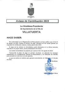 El Ayuntamiento avisa que de conformidad con el Reglamento de Recaudación se hace público que el día 22 de agosto finaliza el periodo voluntario de las cuotas giradas por impuesto de contribución urbana y rústica para el año 2023, los recibos domiciliados se pasarán por cuenta el día 5 de agosto.