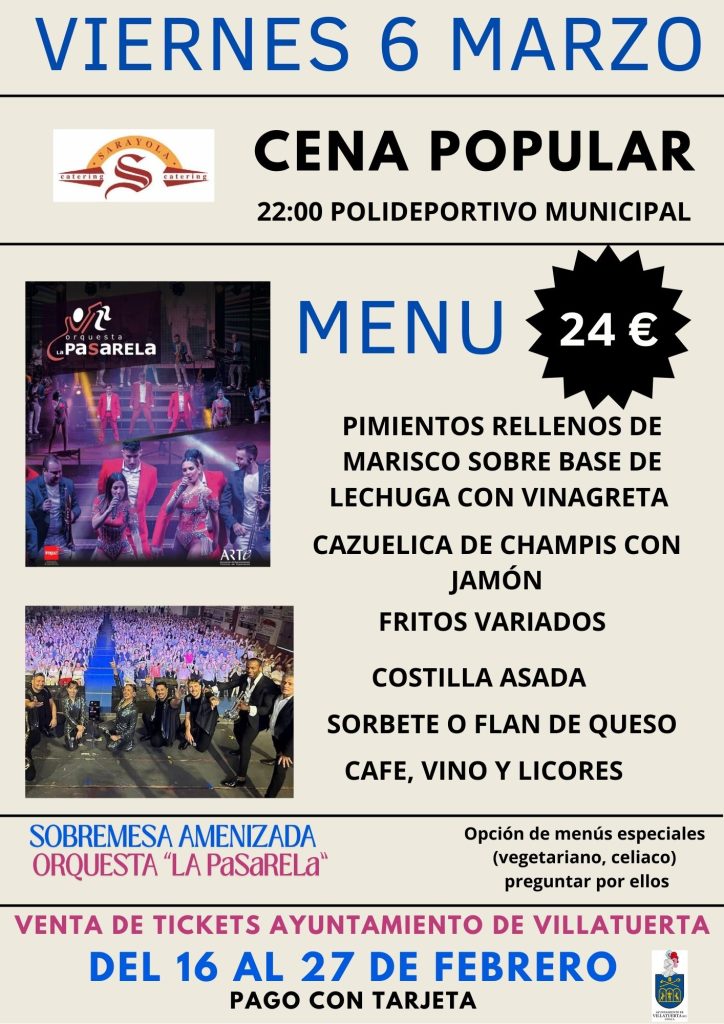 Con motivo de las fiestas patronales de San Veremundo, el Ayuntamiento de Villatuerta ha organizado una cena popular, el viernes 6 de marzo en el polideportivo municipal. La cena correrá a cargo de catering Sarayola y la sobremesa amenizada por la orquesta «La Pasarela».
