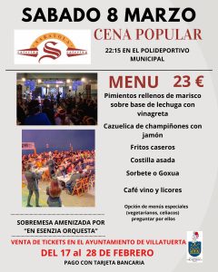 Con motivo de las fiestas patronales, el sábado 8 de marzo el Ayuntamiento de Villatuerta ha organizado la cena popular que tendrá lugar en el polideportivo municipal San Ginés a cargo del catering Sarayola. La venta de tickets en oficinas municipales del 17 al 28 de febrero. La sobremesa estará amenizada por la orquesta «En Esenzia»